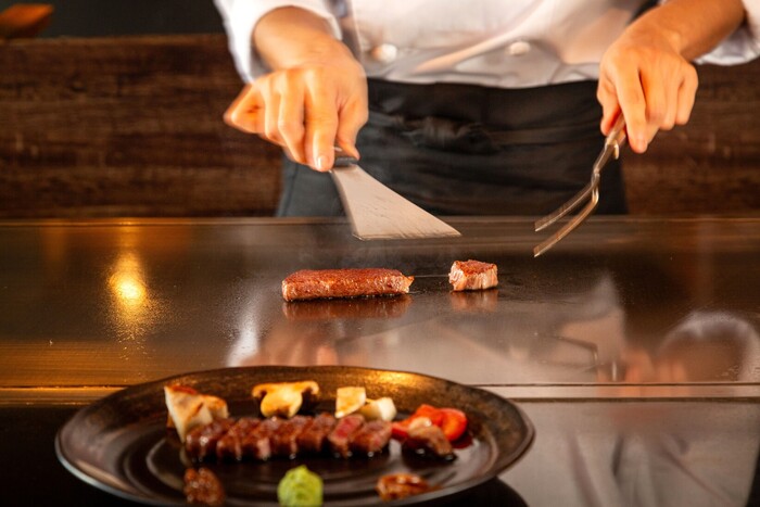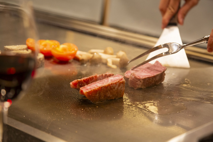 JR元町駅徒歩5分。名門中西牧場の厳選された神戸牛のみを提供しています。一頭買いにより希少部位など幅広い肉質の神戸牛をお召し上がり頂けます。1階・2階フロアとも全席カウンターで神戸牛×鉄板焼きLiveをご賞味いただけます。