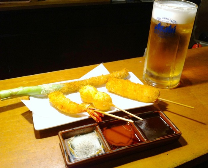 菜種油と生パン粉使用で驚くほどの軽い口当たりの串かつを自分専用のソース皿で。ビールはアサヒビールのマルエフ樽詰め生を使用。 串かつ以外の一品料理もご用意しております。 テーブル席は最大14名様まで(貸切時)着席可。お気軽にお問合せを!