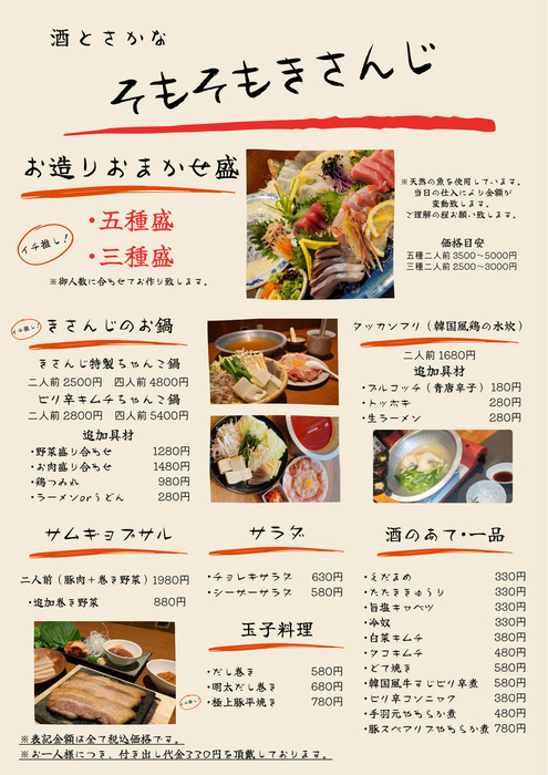 店名の【きさんじ】に込めた「気晴らし」「気楽に」という意味を大切にし、日常の喧騒を忘れられるようなリラックスできる空間をご提供!厳選した鮮魚使用のお造りや、手作りのタレが効いた韓国料理、炭火焼きなど、メニューはどれもこだわりが詰まったものばかり。全国から選りすぐりの日本酒や自家製の果実酒など、ドリンクも充実の内容です。接待からデート、女子会、会社の宴会まで、ぜひさまざまシーンでご利用ください。