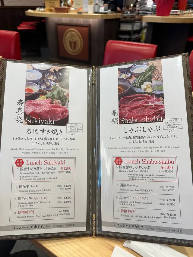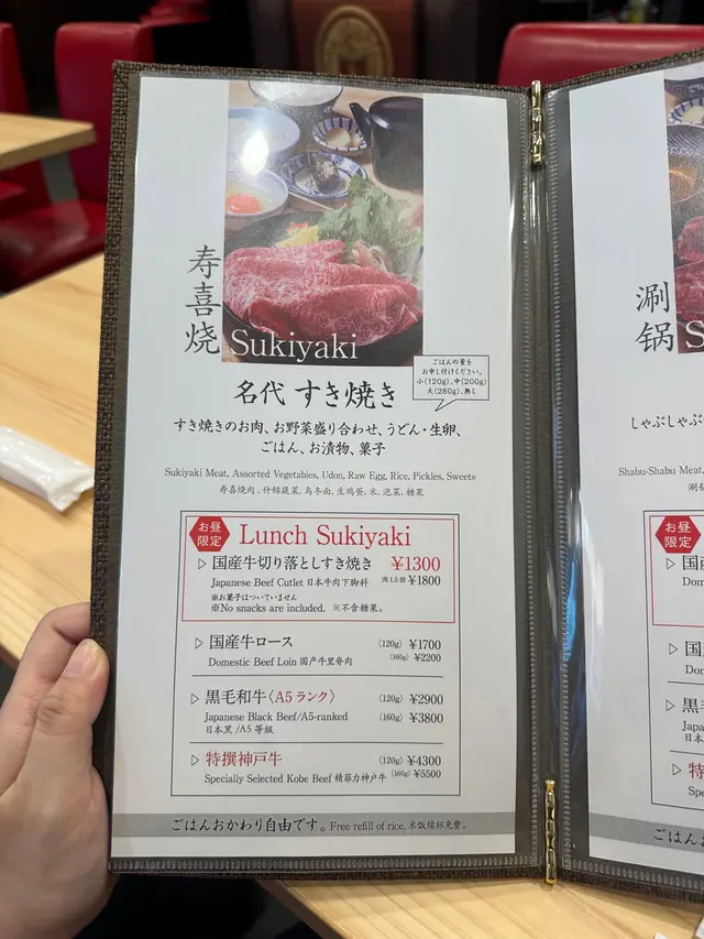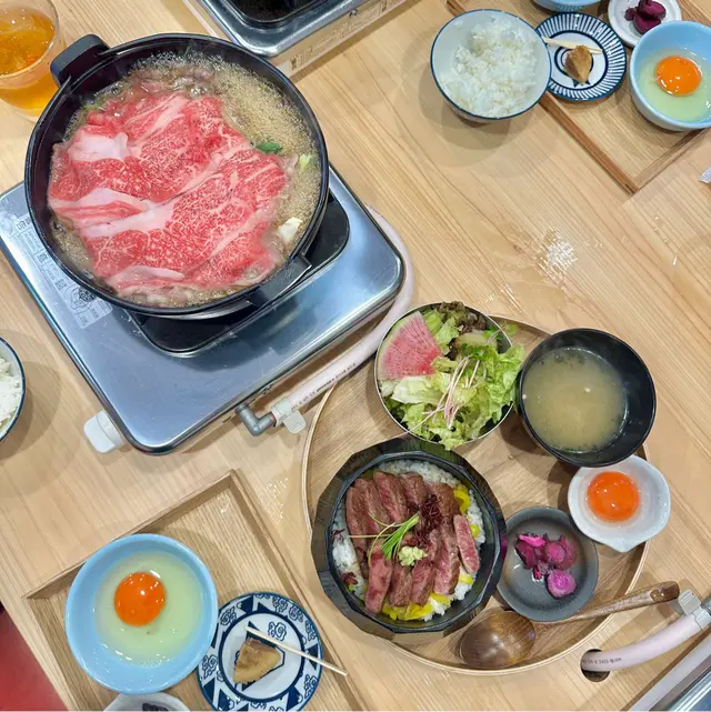 午餐包括什錦蔬菜,烏冬麵,生雞蛋,米飯,醃菜和甜點。神戶和牛油花分布平均,肉味香嫩,沾上蛋液,油脂迅速在口中噴發。白飯還是無限續吃。