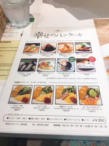 店内は白を基調として明るく、厨房がガラス張りで見えました。注文して焼きあがるまで20分程度時間がかかるようでした。私はベーシックな幸せのパンケーキを注文しました