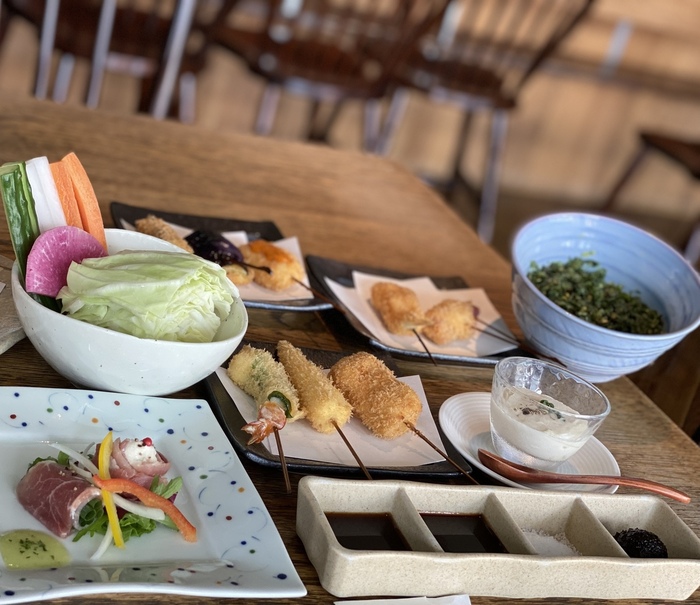 串揚げは、基本的にコースメニューのみで、旬の野菜や魚介、肉などを使用した創作串料理が味わえる。テーブル席からは東京駅舎が見え、眺めは最高です。