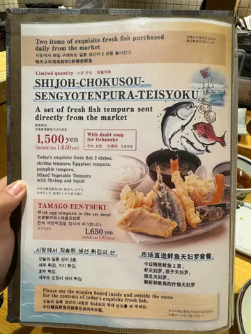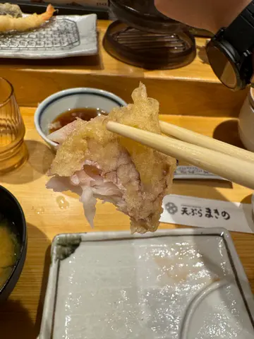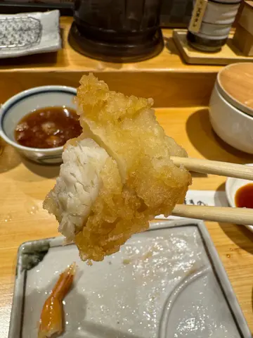 排了半小時入座,可以坐在吧台看師傅炸天婦羅,師傅炸好後也可以直接放到我面前的鐵盤上。我點的鮮魚套餐有每天兩款鮮魚,今天是鯛魚鱸魚,鯛魚是最好吃,非常鮮魚味肉也有口感,鱸魚比較淡但也好吃,還有蝦、茄子、南瓜、鮮蝦魷魚雜錦天婦羅,全部都新鮮好吃,南瓜非常好吃。另一個餐星鰻天婦羅套餐,竟然是整條星鰻,還有魷魚、吻仔魚、茄子、紅薯、舞茸洋蔥雜錦天婦羅,魷魚很厚很好吃。我們也加了蛋天婦羅,外面香脆,內裡還是流心,很好吃。沾天婦羅汁、鹽也不錯,有兩罐前菜可自己舀來吃,醃蘿蔔、漬章魚,漬章魚好吃。最後會有汁給我們做茶漬飯。服務好,價錢也很便宜。…Read More