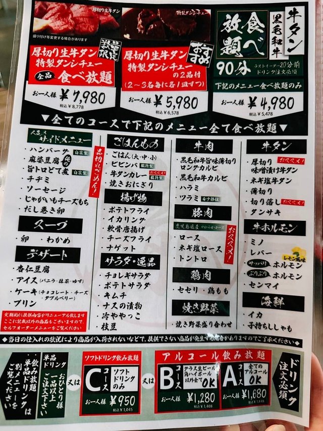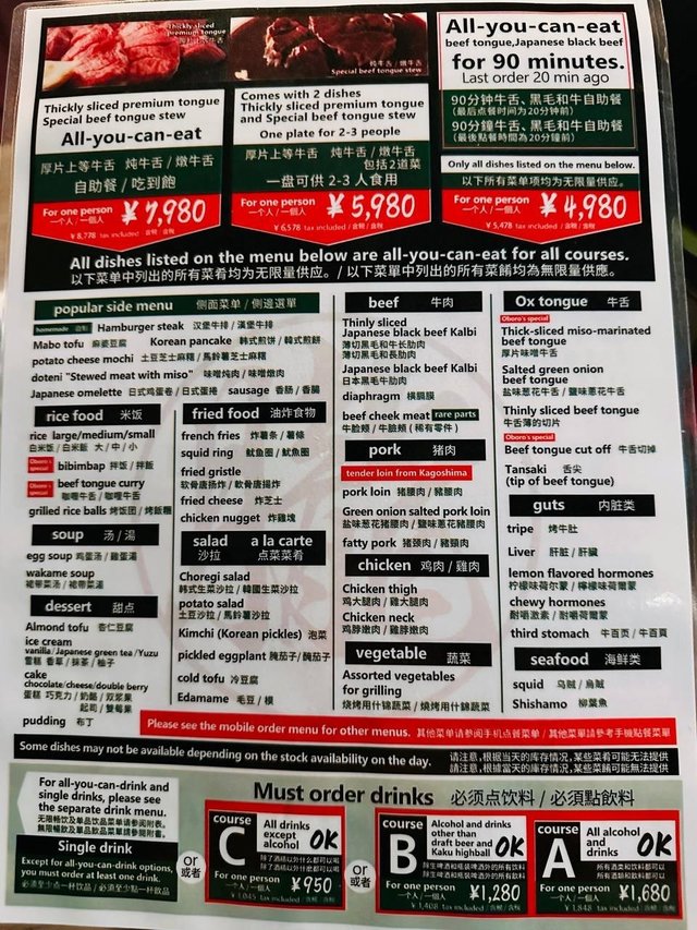 碌ig見到呢間有好澎湃好浮誇既牛舌,不過依家食唔到咁多牛就揀左呢個最平既放題~黒毛和牛牛タン食べ放題(90min) (5,478円),加埋ソフトドリンク飲み放題 (1,045円),2個人total12,946円,即係HKD$720/2店內唔大,偏暗,雖然坐4人枱但都有啲逼,成日撞到後面嗰枱客個背脊😂…Menu有齊日、中同英文,用qr code落單都方便,叫完上菜速度算ok👩🏻‍🏫要留意返因為30min就last order,所以一開始食就要timer⏱️計時60min,倒數完就啱啱好完last order,所以食得有啲chur🫢🔅肉類肉就一般般,牛舌ok既,其他偏肥,似啲頭頭尾尾部位,豬同雞都一般🙂‍↔️🔅炸物有基本野,薯條🍟、雞軟骨、魷魚圈,正常無咩特別~🔅Side menu比較特別有漢堡扒,幾大舊但食落普通🤣;香腸好食;見麻婆豆腐好似幾signature就叫左,超大碟😂,味道正常。韓式拌飯就少少貨不對版,係泡菜飯多過拌飯💬整體唔推薦,環境一般,價錢雖然唔算貴但味道一般,肉類得牛舌係比較ok啲,日本應該有更多更好既選擇🙈…Read More