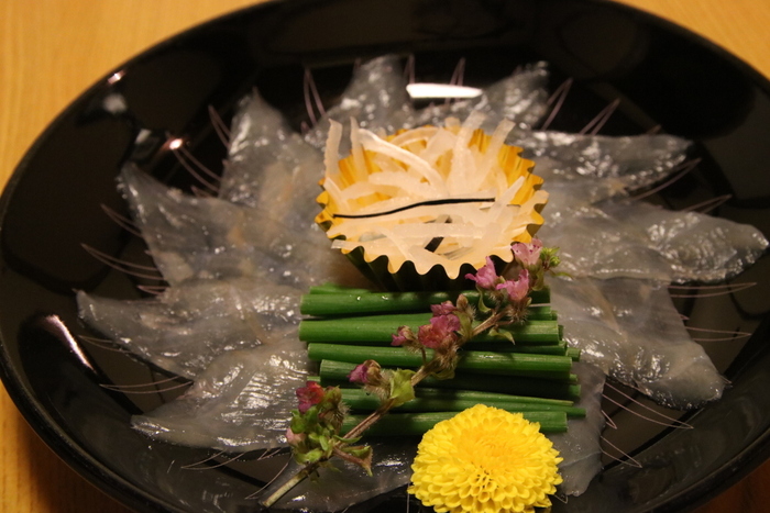 ※早朝にフグを捌いて余分な水分を抜き、熟成させてからお客様の前にお出ししております。