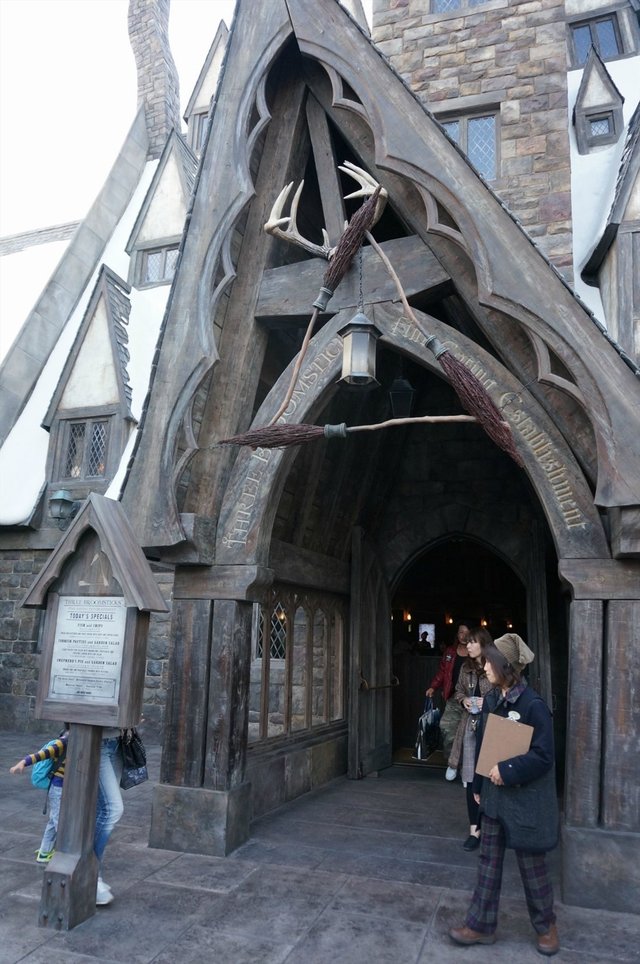 在餐廳門外就看到有 通緝天狼星的海報 呢~跟在電影內第3集出現的那張是一樣的, 而且也一直在動, 好逼真呢~ 接著來到 三根掃把餐廳 , 看看沒什麼人龍, 太好了!! 終於不用排隊可以吃餐安樂飯了!! 看看門口的餐牌, 這裡主要提供的都是英式的餐點, 有羊肉批, 有炸魚薯條等等, 聽起來像是不錯呢~ 餐廳是要先買票再拿食物的, 走進收銀處前, 旁邊還是有一大個櫥窗可以看到食物的模型, 不用怕點錯食物了. 宅女看到中央放著的一大盤燒雞肋肉併盤, 真的超想點來吃!! 不過原來份量是4位用的, 我們只有2個人就有點怕吃不完了...唯有看看其他1人份的主菜吧. 這裡的主菜都幾多選擇的, 當中都以英式食品為主, 來配合主題. 有 羊肉批, 炸魚薯條, 燒雞, 肋肉 等選擇, 每份主菜都有配上一大枝粟米及薯塊, 如果一個人吃都應該夠飽的. 價錢方面又不算好貴, 單人份的主菜都在2,000YEN以內, 以樂園來說算是合理價格吧. 另外如果人多的話, 就可以試試4人份的那個併盤了, 有 燒雞, 肋肉, 粟米, 沙律跟薯塊 等等, 都算豐富. 買了票後就可以拿著票去旁邊取餐, 因為這個時間人不算好多, 所以也能找到位子. 我們就拿好了食物再去找座位. 餐廳其實地方都幾大, 樓底超高, 內裡亦有不少神奇的佈置. 我們這個時間來, 很快就找到位, 不過其實餐廳都仍然坐了8成食客, 都幾熱鬧的. 因為太難選擇, 最後要了一份燒雞配肋肉, 一份炸魚薯條, 還有豆蓉湯. 本來想點奶油啤酒, 不過剛才巳喝過, 反而另一款南瓜汁沒試過, 便買了一枝來試. 不過這樣總計 2個人其實都要4,980YEN 了. 不過有湯有主菜有飲品, 份量都算夠吃的. 先喝個 豆蓉湯 (480YEN) 吧 小小的一碗要480YEN, 其實只有半碗的份量, 不過入口質地濃稠, 是宅女喜歡的口感, 而且是幾CREAM又夠滑溜, 豆味亦算香濃, 本身的湯底其實味道不會好重, 但當中亦加了少許火腿碎, 吃起來更富咸香. 南瓜汁 (800YEN) 聽聞除了奶油啤酒之外, 這個南瓜汁亦是必買的, 而必買的原來不是在於它的味道, 反而是因為這個造型特別的樽身. 這支南瓜汁由美國入口, 樽身看來就真的非常有趣, 樽蓋上更有大大個立體南瓜, 小朋友看到必定喜歡. 南瓜汁其實是由蘋果汁加上南瓜汁混合調製而成, 味道嘛.....第一個感覺是超級甜, 很膩...反正宅女自己就不太喜歡喝, 不過因為要把這個樽也帶回家紀念, 只有跟妹妹一人一口硬著喝光光. FISH & CHIPS (1,750YEN) 一份有三塊長長的炸魚柳, 還在上半碟炸薯塊, 就算吃完炸魚不飽, 吃完這半碟薯塊都應該非常夠飽了. 炸魚柳還附有檸檬片跟他他醬, 洒少許檸檬汁, 再沾上他他醬吃, 咬下去外層都帶點微脆的, 不過炸漿太厚了, 口感有點太粉, 還好內裡的魚柳本身是幾滑的, 肉質仍帶彈性. 而薯塊大大條十分粗身, 熱度夠而且亦算香脆, 沾點他他醬吃不錯. CHICKEN AND PORK RIBS PLATTER (1,950YEN) 這盤主菜比炸魚的份量更多, 價錢貴一點點. 內裡有1/4隻燒雞, 一條肋骨, 原枝粟米, 還加有一少堆炒薯塊. 飽肚度其實這個是比較高的. 燒雞不算大件, 雞皮烤得帶點焦香, 但不是帶脆那種, 不過肉夠肥厚, 肉質嫩滑之餘亦夠彈牙. 而肋骨其實肉很少, 但邊位還是連著少許肥脂, 而且吃到的肉不算瘦, 口感都算豐潤, 而且醬汁惹味得來不會好咸, 用手拿著吃的確是幾滋味的. 不過宅女跟妹妹最愛的還是那條原枝粟米, 吃起來十分香甜多汁, 而且還沒有去掉表層的葉, 拿著來吃有點像中土世紀的感覺呢~ …さらに見る