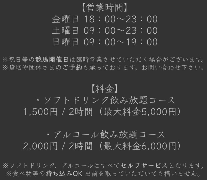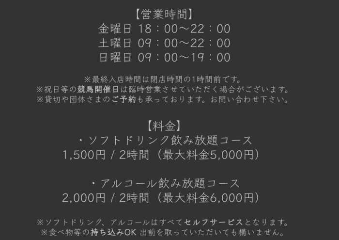 ※祝日等の中央競馬、海外競馬開催日は臨時営業する場合がございます。
