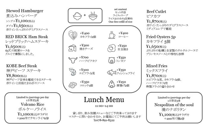 神戸の野菜や淡路産のお米、国産牛などこだわりの食材を使用した料理をご提供する当店。中でも、神戸ビーフを使用したハンバーグがセットの洋食ランチや、低温調理したチキンの「ボルケーノライス」がオススメです!ワインや日本酒などのアルコール類も多彩にご用意。温かみのある店内には、カウンター席とテーブル席を完備しており、貸切も可能なため宴会にも最適です◎ランチやディナーで美味しい洋食をお楽しみください。