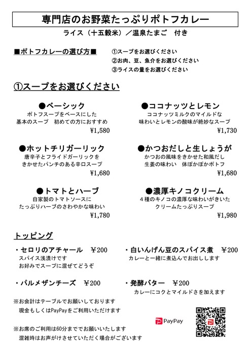 【ランチ】ポトフカレーのみ。※予約はお受けしていません。 スープ終了の場合は早めに閉店いたします。※ランチはお揃いになってからお席にご案内いたします。