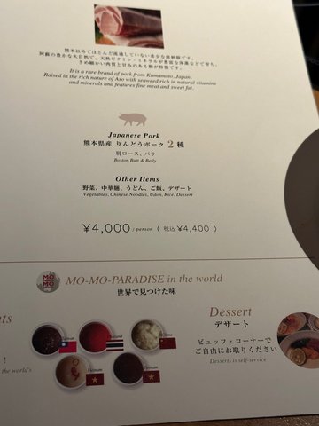 既然來到東京,之前又睇到好幾本旅遊書都有介紹呢間Mo Mo Paradise,就好想去。好彩我們早一晚預訂了座位,否則要等45-60分鐘呢!入面環境少許昏暗,也有很多位。坐低後我們叫了4份Shabu-Shabu(¥2500)+自助汽水吧(¥400)。兩隻肉碌熟哂都夠冧,肥膏一般,質感很好。至於蔬菜,有很多款可供選擇,仲好新鮮呢!服務員會推一架車子來供你挑選。牛肉、豬肉、蔬菜、烏冬、中華麵、日本米飯都可以任添,只要吃得下就叫。值得一提的是,這裏的服務真是太貼心了!服務員會幫你的袋子和外套蓋上布,以免油汁濺到。還有,他們為鍋加水時會用手掩住,以防熱水彈到客人身上。此外,他們更會主動舀走你的鍋的肥油,倒在一個鑵子呢!這些優秀的服務和好吃的任食牛、豬大餐,十分難得!總括而言,好抵食!因此,我們於2/4又去咗食多㳄さらに見る