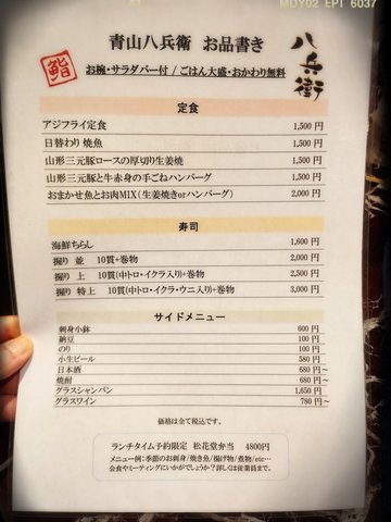 朝早喺表參道血拼完一輪,姨媽話午餐唔想再食原定計劃中嘅牛牛,要求食魚生,小肥唯有搵Google之神幫忙,結果喺區內搵咗間壽司居酒屋「八兵衛」(Hachibe)。店子門外擺出日英對照嘅午市餐牌。入口處有幾級樓梯,真係要小心睇路行。八口子冇訂位,所以要分開兩張枱坐。花紋多多嘅餐桌黐黐立立,濕毛巾就放喺枱面