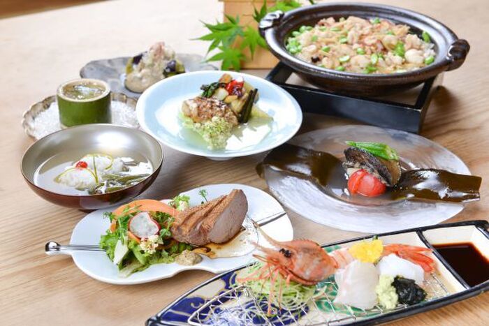 ソラマチ最上階の國見からは都内、富士山、舞浜方面まで見渡せる夜景と景色を楽しめる空間です。料理は、これからの季節にぴったりなかに料理や鴨料理をはじめ、季節の食材をふんだんに使った会席コースやカジュアルなアラカルト料理もご用意。
