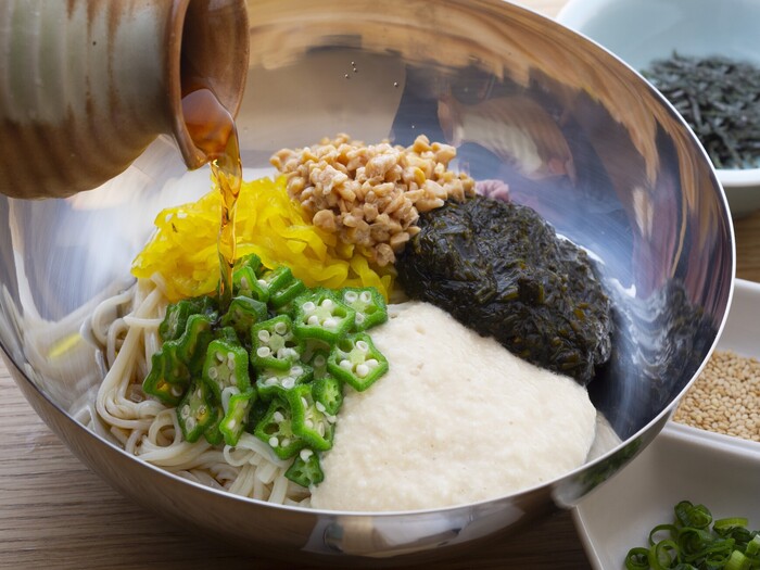 日本三大そうめんの一つである、強いコシとなめらかなのど越しが特徴の小豆島そうめんブランド「島の光」そうめんと、お客様の目の前で新鮮な食材を揚げ、直接ご提供する天ぷらが自慢の店。