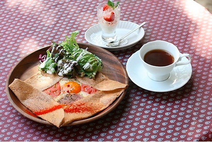 アンティークの家具のしつらいとナチュラルな庭の作り。こだわりの空間は、幅広い年齢層の女性に愛されています。フランス・ブルターニュ地方の家庭料理・ガレットをメインにメニューを展開。食材は地産地消。生地には常陸秋そばのそば粉、奥久慈のたまごを使用。筑波山麓で栽培している農家から仕入れているそば粉のもっちりとした食感をお楽しみ下さい。具には筑波ハム。コーヒーは地元の人気店 旅人のコーヒーといったのものを。