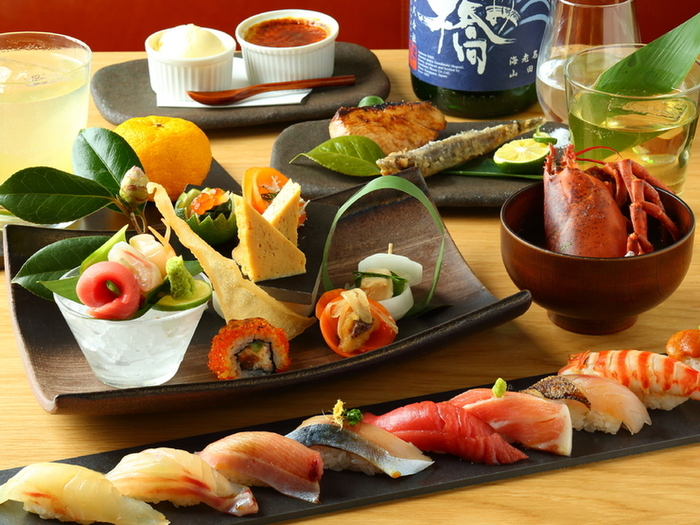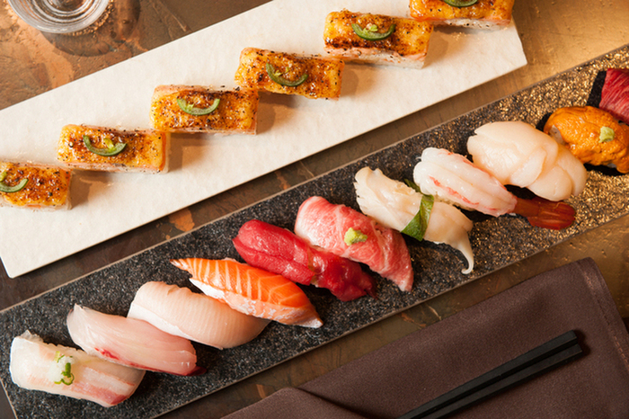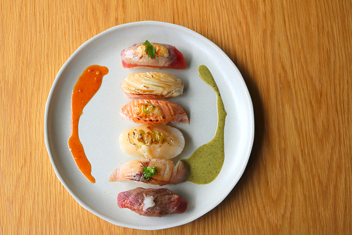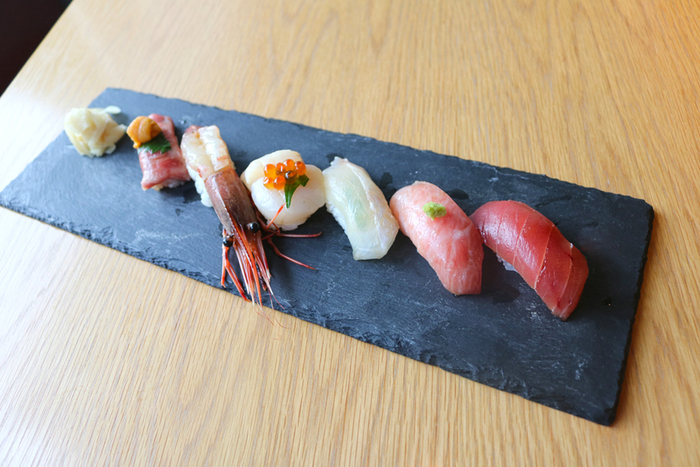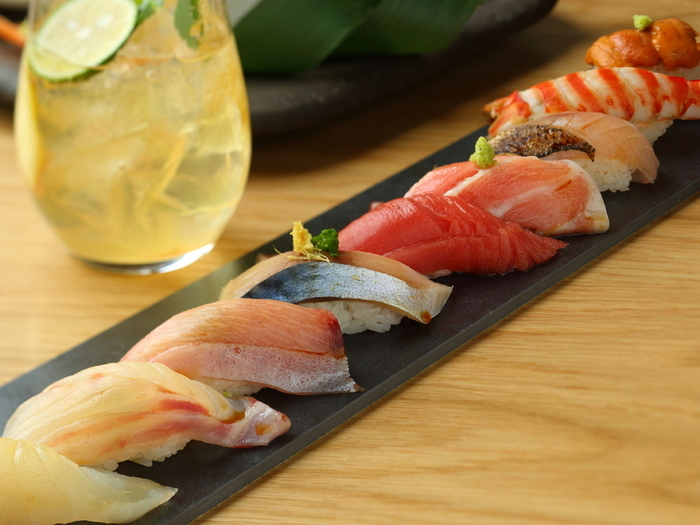 「KINKA」では、ひと手間かけた美味しい寿司・刺身・タパスなどを、ラグジュアリーな上質空間でカジュアルにお愉しみいただけます。デートや女子会はもちろん、誕生日や記念日のお祝い、仕事帰りの普段使いなどにもおすすめです。名物の炙り寿司は、握り・押し寿司・ロールの3種類をご用意し、新感覚の美食体験をご提供しております。多彩なワインや日本酒を嗜みながら、いつもより少し贅沢な大人の時間をお過ごしください。