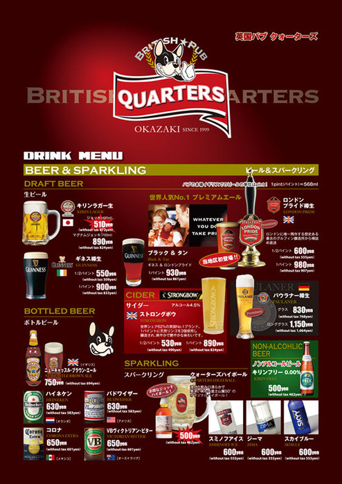 ブリティッシュパブ クォーターズ (名古屋/中部) 網址: https://s.openrice.com/UbbSLG3iqSB00 地址: 名古屋/中部岡崎愛知縣岡崎市明大寺本町4-29 電話: +81 0564-64-3680