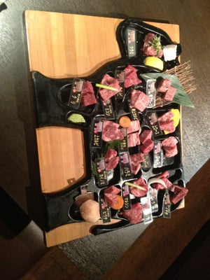 【うし田】的招牌「一頭牛套餐」(需提前一天於網上預約)共有19款不同部位的牛肉,如牛屁股及牛面頰肉等,每款約有1-2件,更用上頗具特色的牛形盤上菜。