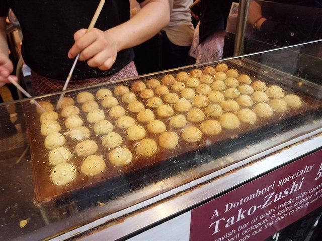 即日來回的第四站:たこ家道頓堀くくる章魚燒在大阪,在兩種必食的食物,包括:大阪燒和小丸子!大阪燒有大阪兩個字,當然要食啦!至於小丸子,小丸子會淋上大阪燒醬,也是叧一必食食物,當然還有箱壽司,炸串等等啦。道頓堀,位於心齋街的旁邊,是遊客必到的地方。除遊客,你最常見到小丸子舖。邊走邊吃,方便要Shopping的你。小小一粒,方便要吃多餐的你。小丸了子味道都差不多,個人認為找一間多人排隊多人吃的,就應該不錯。有些餐廳沒人光顧,小丸子不停的燒,不會好吃呢。小丸子不停的轉阿轉,香噴噴的樣子,太吸引啦!
