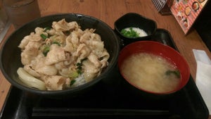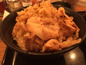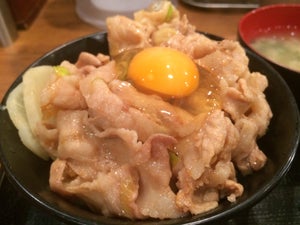 該店的豬肉丼物是先用大蒜特製的醬油蘸上豬肉,再鋪滿於白飯上。店家只會在下單後才開始製作,保證新鮮。