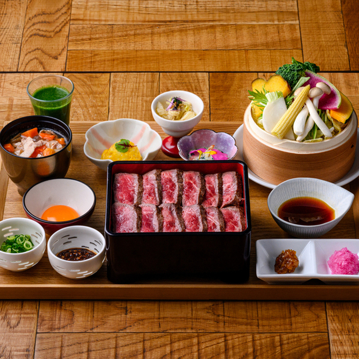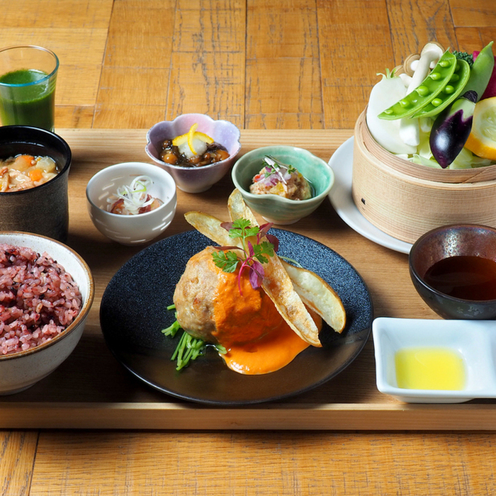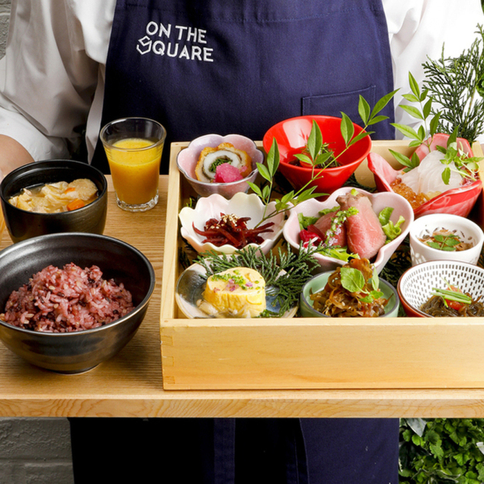 オンザスクエアの定食は、新鮮な野菜をそのままジュースにした食前メニュー「グリーンジュース」に、主菜と小鉢3種、十六穀米のご飯、豚汁が付きます。さらに土鍋を使ってお席で炊き上げる「土鍋おぼろ豆ふ」か、素材の旨味を活かした「野菜せいろ蒸し」のどちらかをお選びください。オフホワイトを基調とし、緑をあしらったスタイリッシュな空間で、今日の自分に心地よい、お食事の組み合わせと愉しみ方をぜひ発見してください。