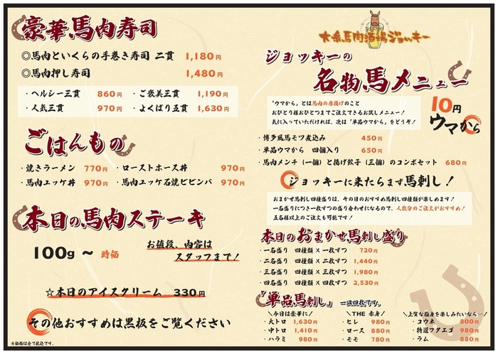 大衆馬肉酒場 ジョッキー 柏店 (東京/関東) 網址: https://s.openrice.com/UbbSB037iGB00 地址: 東京/関東柏韆葉縣柏市柏2-3-14 電話: +81 04-7192-6222