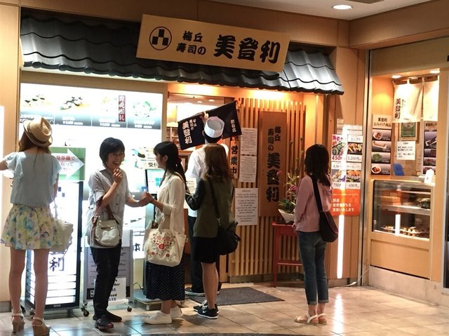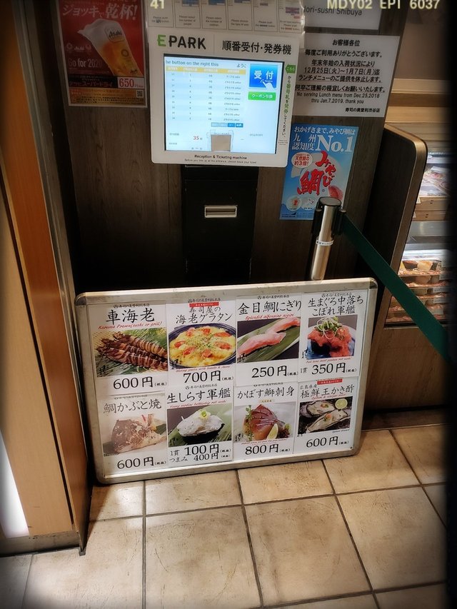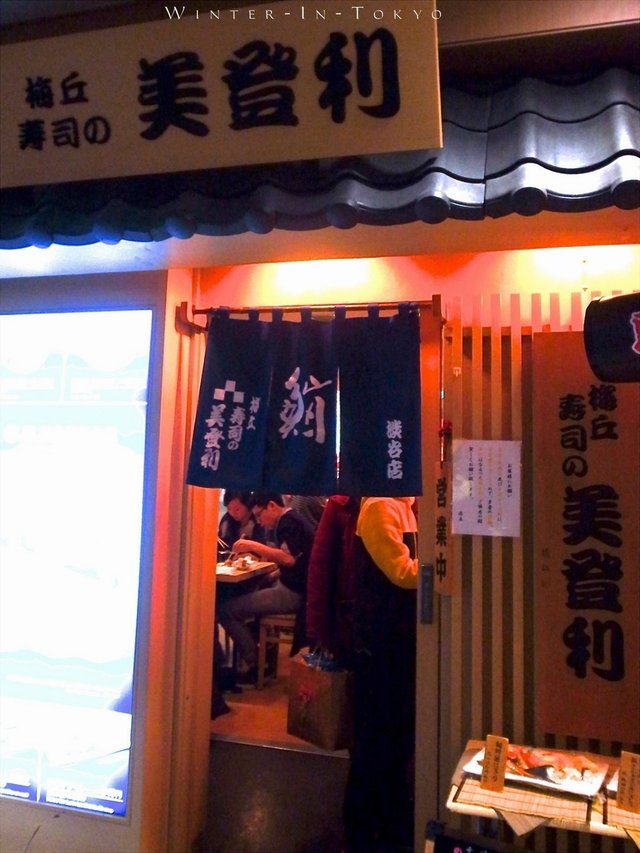 ,結果朝早退咗酒店房後哥哥就帶路去地圖顯示為最近嘅連鎖壽司屋「梅丘寿司の美登利総本店渋谷分店」食個早午餐。八口子十一點左右到步,一如所料,長長嘅走廊及門前早已排滿及坐滿攞咗飛嘅食客等位