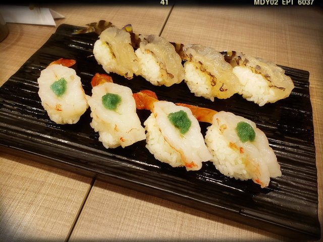 牡丹蝦壽司(400円/件)+車海老壽司(600円/件):唔知係咪師傅有意俾個機會大家比較一下呢,兩款蝦壽司拼埋一齊上。相中上方晶瑩透光嘅為活車海老壽司,而下方連翠綠色蝦籽嘅則為牡丹蝦壽司,兩者均厚潤爽脆,鮮甜無比