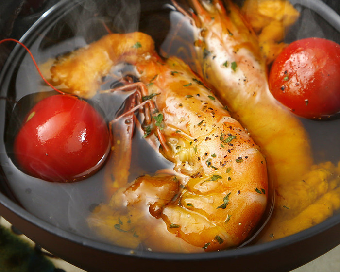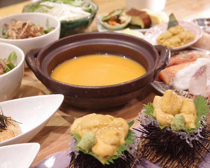 招牌菜為海膽火鍋及流心炸海膽可樂餅,海膽火鍋湯底呈鮮橙色,喝一口已覺鮮味十足。配菜除了可選蔬菜及海鮮組合之外也可選配牛肉,每款均配有海膽刺身,吸盡海膽美味精華後別具滋味。
