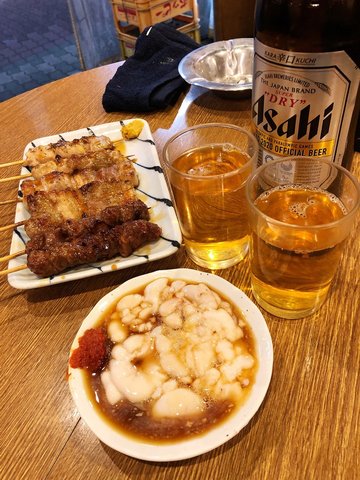 住上野搵宵夜非常方便,我們好想食串燒感受一下當文化,我們最後一晚在上野就去食宵夜嘆下先,路過見到這店是立飲好有風味,所以不用猶豫立刻進店,店員很好盡力用日文及身體語言解釋給我們聽,因為這裏沒有任何相片餐牌而餐牌掛在店內全日文,那我們運用身體語言去叫我們的食物,又嘗試用電話翻譯,終於叫到食物,我們叫了串燒,燒得非常好味,當然叫了啤酒襯托一下,爽👍🏻記得這間店是叫完食物要立刻付款的😊而且店員很好還幫我們拍照😊