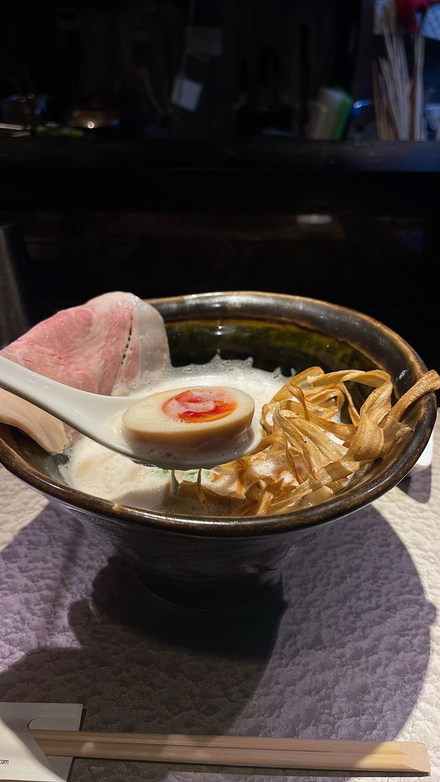 星期日11:25黎排隊,排隊觀光客都接近一半😆~排隊時要喺門口點餐機買埋飛仔,留意返部機淨係收現金💴。1215排到,店內座位唔多,但坐得舒服,2個人仲有卡位坐☺️🔅特製鶏soba (1,410円)有2大片叉燒、2件雞胸同1片鴨胸,仲有炸牛蒡。湯幾濃,麵夠掛汁,不過食到尾就有啲膩。叉燒同鴨胸ok既,但雞胸唔夠之前名古屋食過嗰間滑,普普通通😂,但呢個價錢有咁多餸真係cp值爆棚!🔅肉寿司(2貫) (390円)見幾特別所以加埋,又幾唔錯😚~長到浮誇既牛輕輕灸燒過,有少少鹽調味已經好夠💮🔅唐揚げ(2個) (200円)炸雞好好食,好juicy好嫩👍🏻!炸完一碟應該見太細舊定有舊得皮,所以又炸多左舊雞拎黎😂,不愧係日本人💬円比以前平(雖然都貴返少少),所以食拉麵真係好抵!不過要排太耐,下次會想試其他🫣…畢竟大阪太多美食😌…查看更多